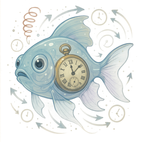 The Timefish is a creature neither bound by tide nor timeline. Its scales shimmer with fragments of forgotten futures and fading pasts, reflecting colors no longer visible to the present.